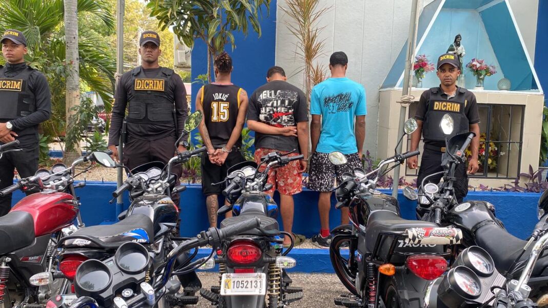 Durante la operación fueron apresados Emmanuel Montero Montero, de 19 años; Carlo Manuel de la Rosa (a) Carlito, de 31; Gabriel Turbi Cuevas (a) Gabi Mocha, de 32; Joel Encarnación Guzmán (a) Teletuvi, de 27, y Markin de León Mateo, de 38, todos residentes en diferentes sectores de esta ciudad.A los detenidos se les ocuparon varias motocicletas con denuncias de robo, entre ellas: una Bajaj Platina 125, color azul/negro, despojada mediante atraco a un ciudadano, de 27 años; otra Bajaj Platina, color negro, placa K2325397, sustraída a un ciudadano, de 46 años; y una tercera Bajaj Platina, color azul, robada a su legítimo dueño, de 38 años.