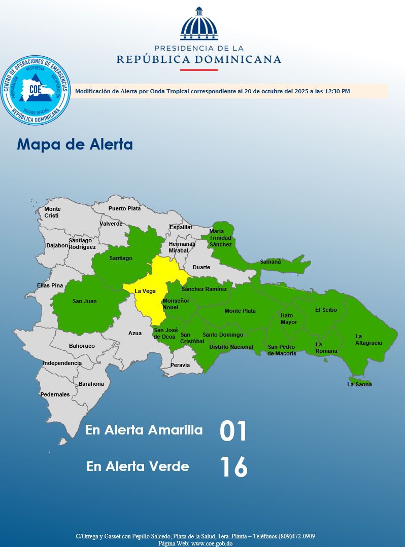 Se encuentra en alerta amarilla la provincia La Vega, mientras que en alerta verde están Sánchez Ramírez, Samaná, Monseñor Nouel, María Trinidad Sánchez, San Juan, Santo Domingo, San Pedro de Macorís, Santiago, Monte Plata, La Romana, el Distrito Nacional, La Altagracia, San José de Ocoa, San Cristóbal, Hato Mayor y El Seibo.El COE exhorta a la población a mantenerse atenta a los próximos boletines y seguir las orientaciones de las autoridades ante la evolución de este sistema tropical.