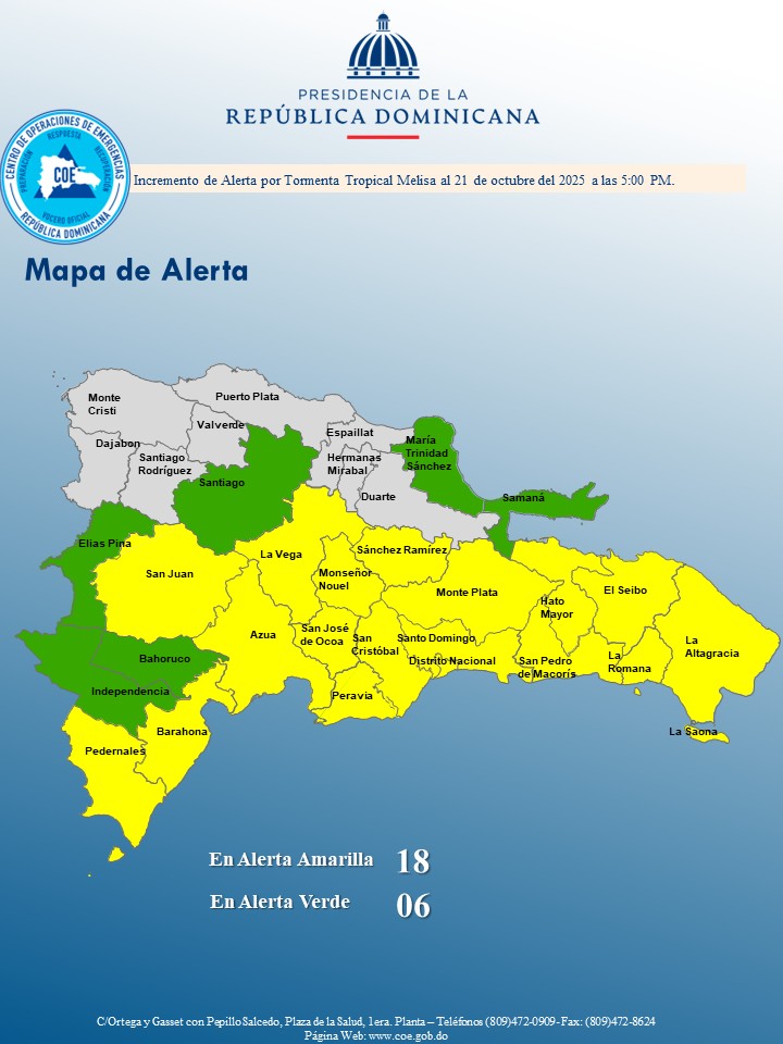 Santo Domingo.- La Dirección del Centro de Operaciones de Emergencias (COE) modificó este martes los niveles de alerta para varias provincias del país, debido a los efectos asociados a la tormenta tropical Melissa, que continúa desplazándose sobre el mar Caribe con posibilidad de fortalecerse a huracán en las próximas horas.