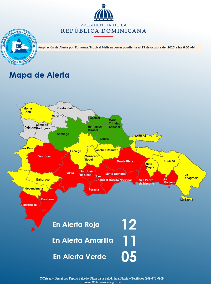 Santo Domingo.- El Centro de Operaciones de Emergencias (COE) mantiene 28 provincias bajo alerta debido a los efectos de la tormenta tropical Melissa, que continúa generando lluvias intensas y condiciones peligrosas en gran parte del territorio nacional.