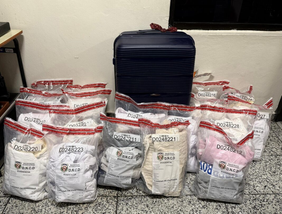 “En el interior del equipaje se incautaron 12 franelas, 53 poloshirt, 09 pares de medias, (18 unidades), 15 abrigos, 02 toallas, 01 pantaloncillo, 01 sabana, 05 unidades de ropa para bebe y 04 pantalones; cabe destacar que las unidades actuantes eligieron al azar una de las prendas, la cual al ser sometida a una prueba de campo, arrojó positivo a cocaína” La mujer de 53 años será sometida a la justicia en las próximas horas por violacion a la ley 50-88, sobre drogas y sustancias controladas, mientras el Ministerio Público y la DNCD, desarrollan las investigaciones de lugar para determinar si hay otros implicados en el caso.