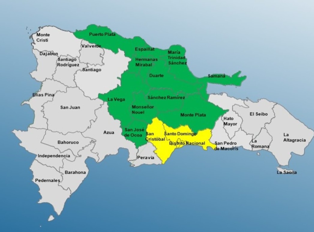 Las demarcaciones en alerta amarilla figuran: San Cristóbal, Santo Domingo, Distrito Nacional,