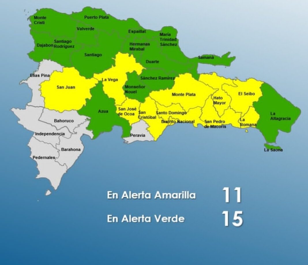 En alerta verde están: María Trinidad Sánchez, Valverde, Duarte (en especial el Bajo Yuna), Monte Cristi, Santiago Rodriguez y Semana, Sánchez Ramírez, Monseñor Nouel, Azúa, Santiago, Puerto Plata y Hermanas Mirabal.